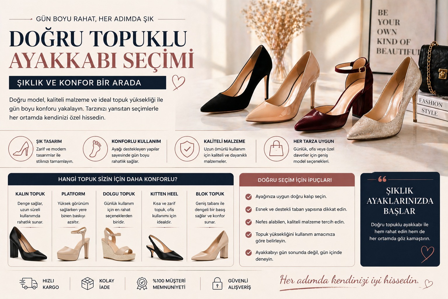 Topuklu ayakkabı kullanımı sanıldığı kadar zor olmak zorunda değil. Doğru kalıp, dengeli yapı ve kaliteli malzeme tercih edildiğinde gün boyu konfor sağlanabilir. İhtiyacınıza uygun bir kadın topuklu ayakkabı seçimi ile hem şık bir görünüm elde edebilir hem de gün içinde rahat hareket edebilirsiniz.